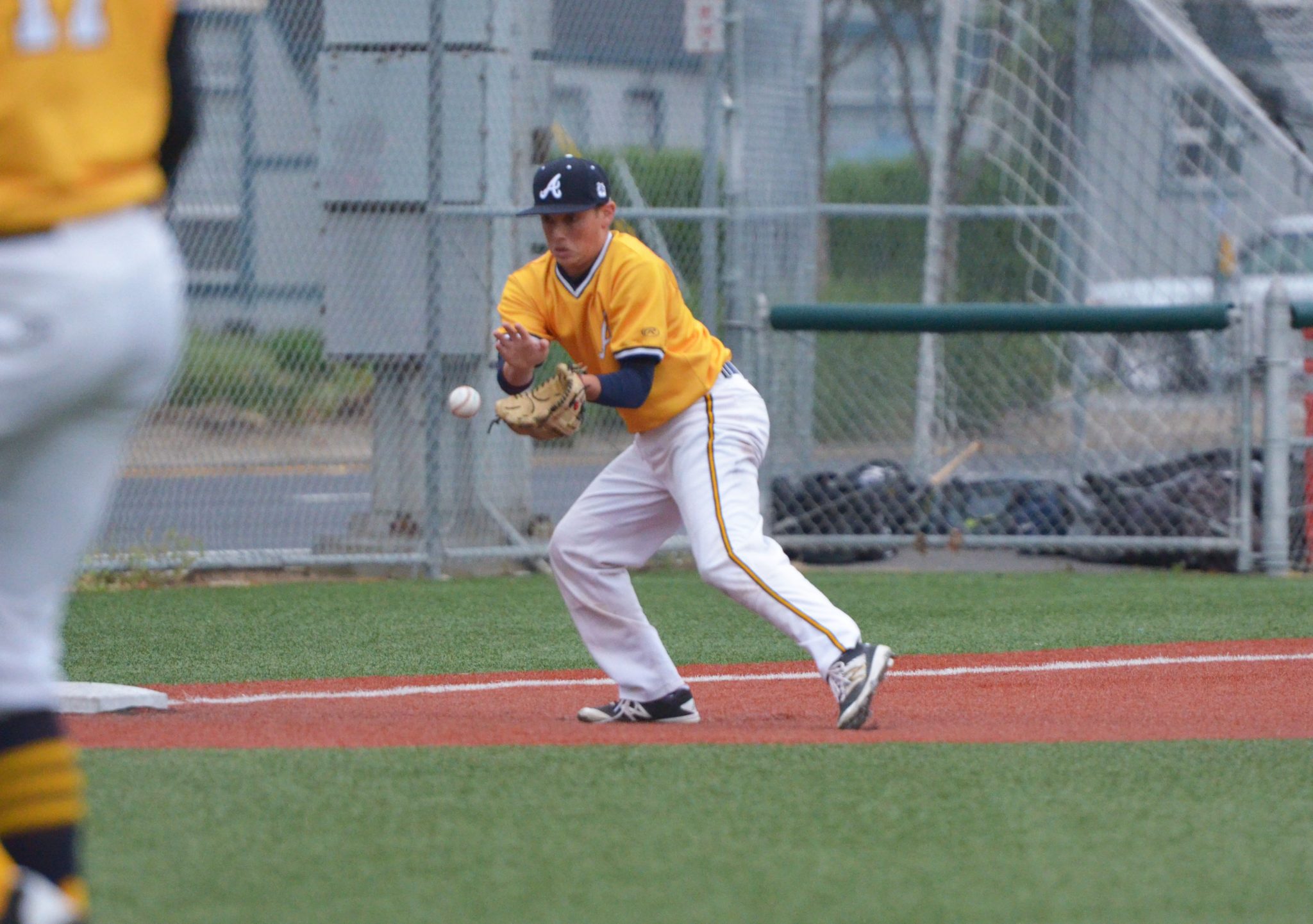 Alhambra’s Dominic Pruett fields a ball at third base in the Bulldogs suspended game in the Easter Tournament. The game was suspended with Pittsburg up 1-0 in the fifth inning. (GERARDO RECINOS / Martinez Tribune)