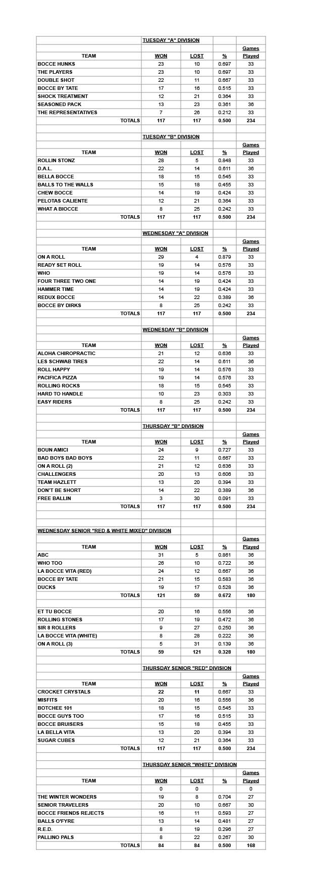 The Martinez Indoor Winter League consists of 58 teams, and over 500 players participating. Courts are located at NorCal Courts, 360 Ferry St., Martinez. Standings current as of Friday, Feb. 10, 2017