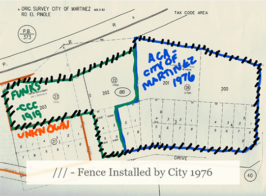 By 1976, the last surviving member of the ACA died causing the City of Martinez to step in and claim ownership of its property. This prevented the State of California from seizing the land for unpaid back taxes and selling it to a developer. After receiving the land, city officials installed a chain link fence around what they considered the cemetery’s perimeter. This resulted in the permanent segregation of Blocks ½ and 1 from the rest of the acreage, (at some point after passing through numerous hands, the County eventually acquires the property).