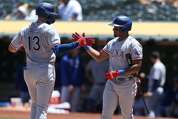 Joey Gallo is greeted at home plate by Andy Ibáñez following his two-run fifth inning home run during the Rangers 8-3 win over the A’s Thursday afternoon at the Coliseum.
