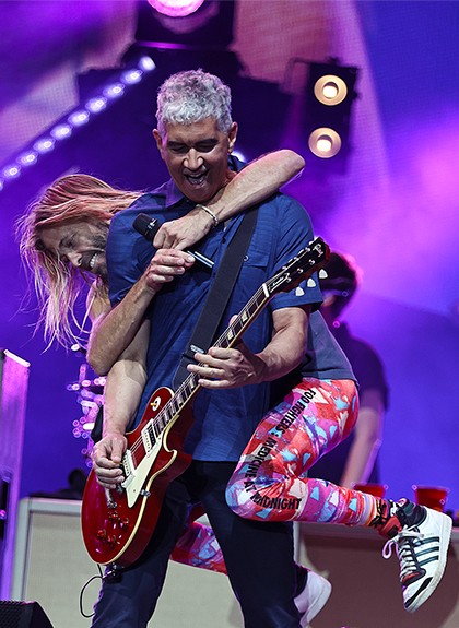 Taylor Hawkins has some fun straddling Pat Smear while performing Queen’s “Somebody To Love” during Foo Fighters set at BottleRock Sunday night in Napa.