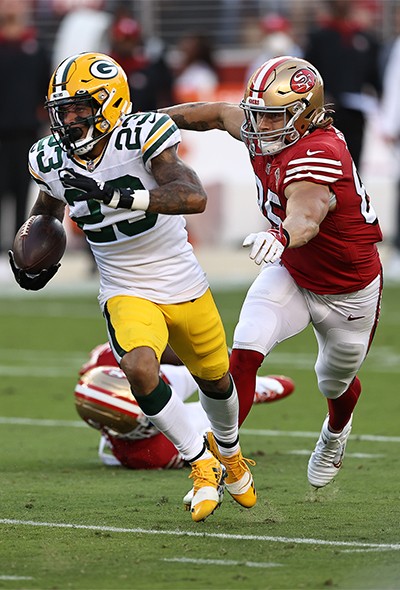 Jaire Alexander returns an inception as he tries to elude the outstretched arms of George Kittle during Green Bay’s 30-28 win over the 49ers Sunday night.