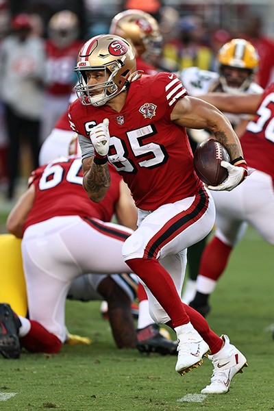 49ers tight end George Kittle runs with the ball following a first half reception during San Francisco’s 30-28 loss to the Green Bay Packers Sunday night at Levis Stadium.