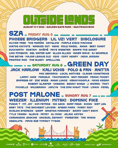 Outside Lands’ festival producers Another Planet Entertainment and Superfly are excited to share the daily lineups for the 2022 festival in San Francisco’s Golden Gate Park. The stacked festival bill features SZA, Phoebe Bridgers and Lil Uzi Vert on Friday, Green Day, Jack Harlow and Kali Uchis on Saturday, with Post Malone, Weezer and Illenium closing out the festival on Sunday.