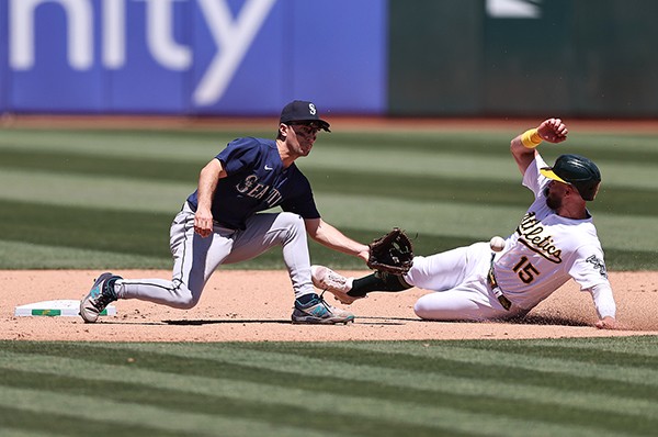 Seth Brown steals second base ahead of the throw to Adam Frazier in the seventh inning of Seattle’s 2-1 win over the A’s Thursday afternoon.