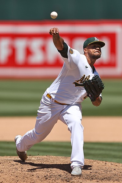 Frankie Montas delivers a pitch Thursday afternoon on the way to 7 2/3 innings of no-hit pitching against the Mariners. It wasn’t enough as Oakland’s bullpen blew the game in the ninth and Seattle scored a 2-1 victory.