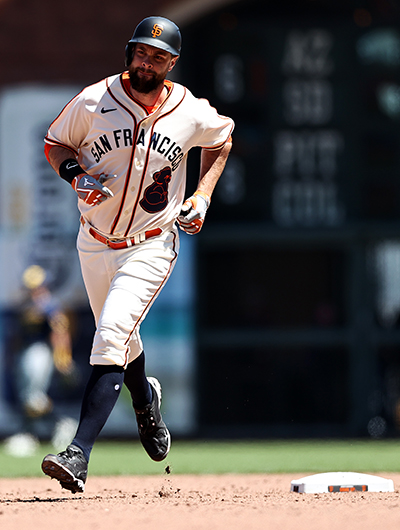 Brandon Belt rounds the bases following his two-run homer during the sixth inning of San Francisco’s 9-5 win over the Brewers Sunday.