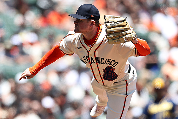 Logan Webb delivers a pitch during the Giants win over Milwaukee Sunday. The win improved Webb’s record to 9-3.