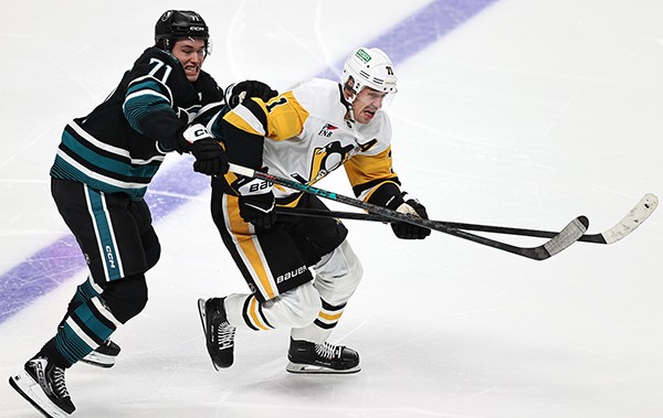 San Jose’s Macklin Celebrini and the Penguins Evgeni Malkin fight for the puck during Pittsburgh’s 3-0 win over the Sharks Saturday night.