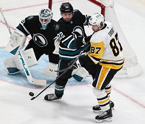 Sidney Crosby and Evgeni Malkin each had a goal and an assist and Tristan Jarry stopped 31 shots to lead the Pittsburgh Penguins to a 3-0 win over the Sharks Saturday night at SAP Center.