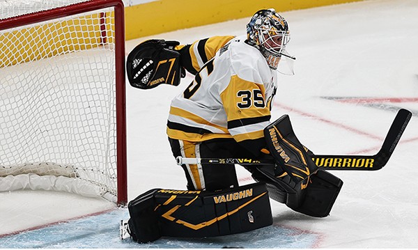 Pittsburgh’s Tristan Jarry deflects a shot on the way to a 3-0 win over the Sharks Saturday night.