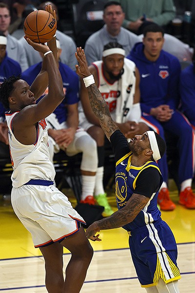 OG Anunoby goes up for a shot over Gary Payton II on the way to a team leading 25 points, but the Knicks fell to the Warriors 126-113 Thursday night.