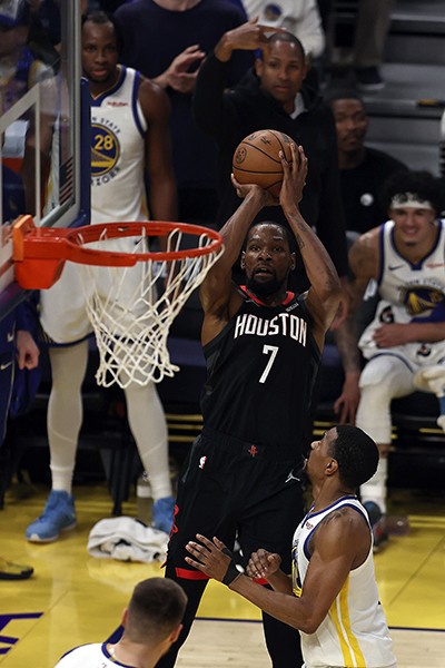Houston’s Kevin Durant goes up for a jumper on the way to a game high 31 points during the Rockets 117-116 win over Golden State Sunday night at Chase Center.