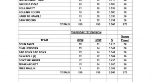 The Martinez Indoor Winter League consists of 58 teams, and over 500 players participating. Courts are located at NorCal Courts, 360 Ferry St., Martinez. Standings current as of Friday, March 4, 2017.