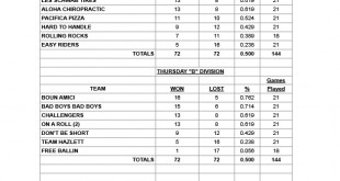 The Martinez Indoor Winter League consists of 58 teams, and over 500 players participating. Courts are located at NorCal Courts, 360 Ferry St., Martinez. Standings current as of Friday, Dec. 23, 2016.